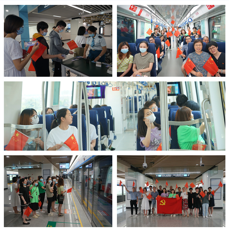 下午1:20,黨員職工們在大廈底樓集合,一起興高采烈出發(fā)至皮革城站入口,換票、安檢、檢票進(jìn)站后,踏上了杭海城際鐵路的試乘旅途。大家手舉小紅旗,激動(dòng)之情溢于言表。
