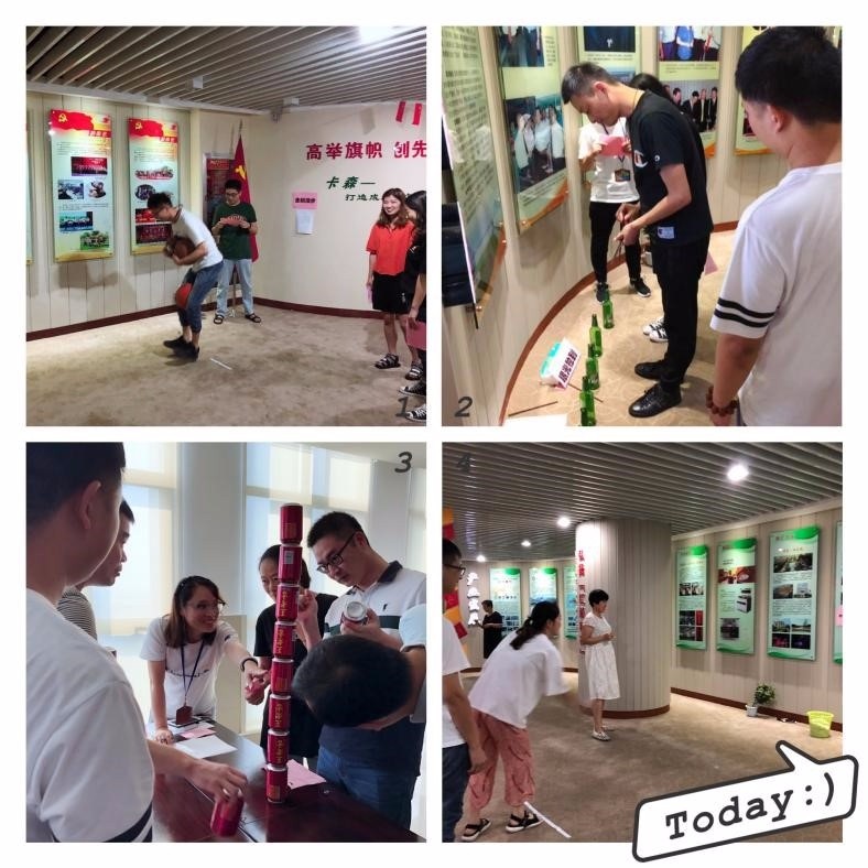 企鵝漫步其實是要求游戲者腋下夾兩個球,雙腿間再夾一個球,越過障礙走一個來回???,我們小陸同學(xué)像不像一只企鵝。易拉罐積木是一正一反依次往上疊,果然高手在民間,瞧,我們葛經(jīng)理竟疊起了8個,直叫人拍手叫好。其他項目也是一片熱鬧景象,現(xiàn)場一片歡聲笑語。