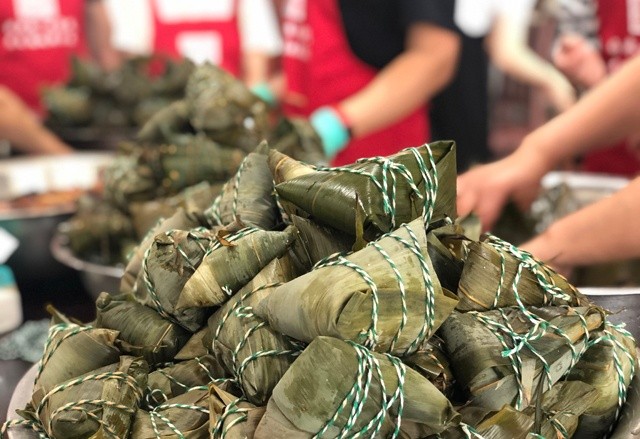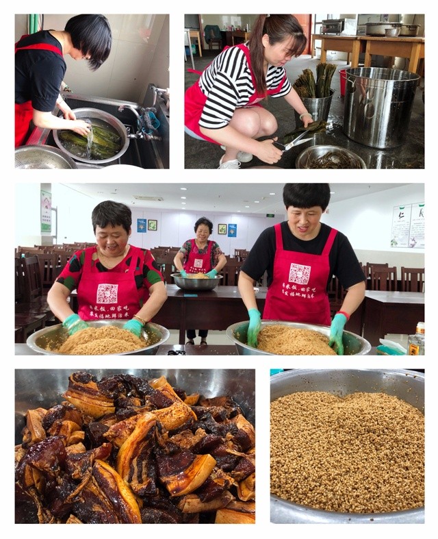上午8點,包粽子能手們早早來到了23樓,洗粽葉,泡糯米、腌配料,每一項工作都在有條不紊地進行中。